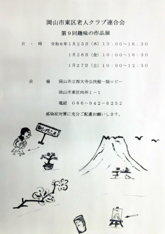 東区老人クラブ連合会 第9回趣味の作品展 2024.02.06 東区老人クラブ連合会が令和6年1月25日(木)~1月27日(土)に岡山市立西大寺公民館1階ロビーで「第9回趣味の作品展」を開催し、会員からの力作36点を展示しました。 ※画像はクリック(パソコン)もしくは指先タッチ(スマートフォン、タブレット)で拡大されます。 開催前日の1月24日(水)から全国的に気温が低くなり、作品展初日はとても寒い日でしたが、 たくさんの人が見学に来られました。 ※画像はクリック(パソコン)もしくは指先タッチ(スマートフォン、タブレット)で拡大されます。