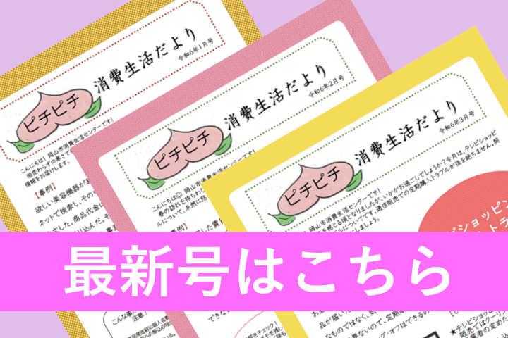 ピチピチ消費生活だより令和6年2月号と3月号を公開! 2024.11.16 岡山市消費生活センターの啓発チラシです。見守り活動の際や会議の際に、 注意喚起資料としてご活用ください。 公開ページはこちら! ピチピチ消費生活だより_令和6年2月号ダウンロード ピチピチ消費生活だより令和6年3月号ダウンロード